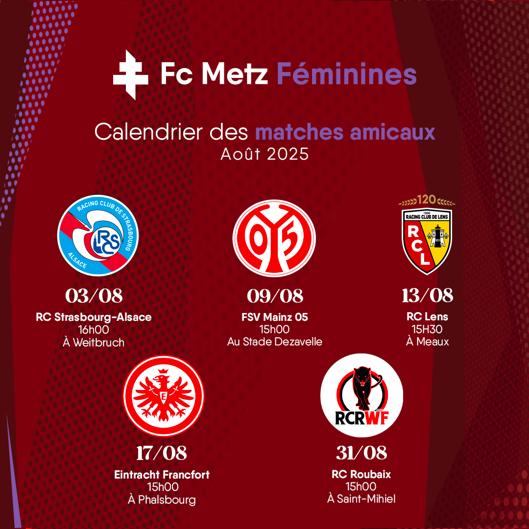 - FC Metz - RC Roubaix, le dimanche 31 août à Saint-Mihiel (coup d'envoi à 15h00)