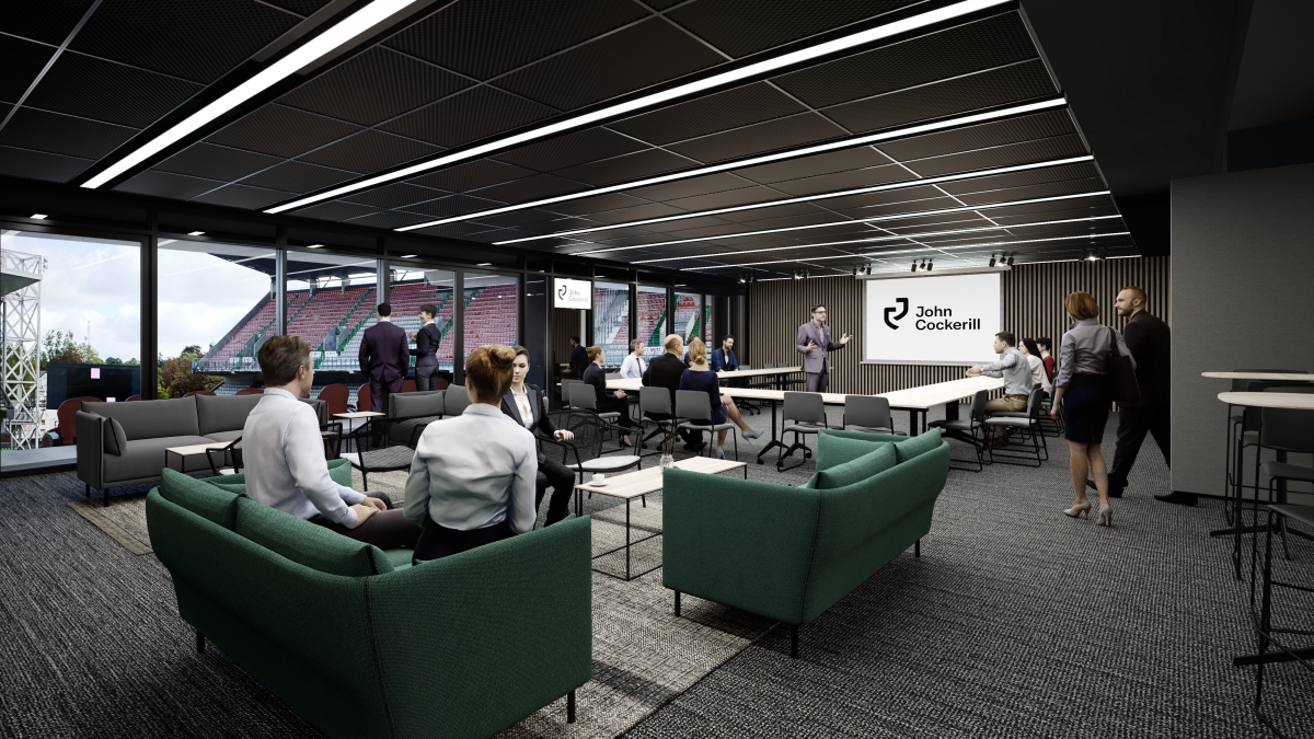 Dans un angle de la nouvelle Tribune Sud sont aménagés des espaces de travail destinés à être loués à l’année à des entreprises locales ou régionales, notamment des médias.