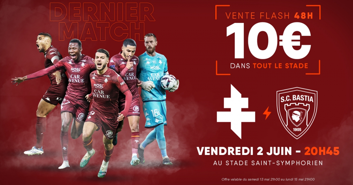 Ne manquez pas la réception du SC Bastia, à l'occasion de la 38ème et dernière journée de Ligue 2 BKT ! Le coup d'envoi de cette rencontre sera donné le vendredi 2 juin à 20h45 au Stade Saint-Symphorien.
