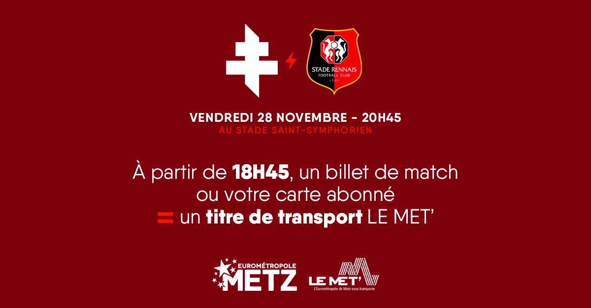 Ce vendredi 28 novembre à l'occasion de la réception du Stade Rennais au Stade Saint-Symphorien, l'Eurométropole de Metz et LE MET' mettent en place un dispositif spécifique "jour de match".