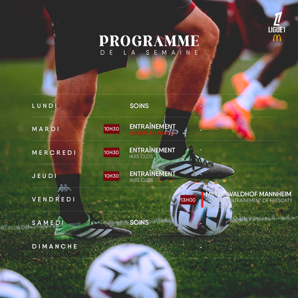 Le programme de la semaine du groupe professionnel est désormais disponible. Si vous souhaitez assister à un entraînement ouvert en public à Frescaty, en groupe, nous vous invitons à contacter communication@fcmetz.com afin d'anticiper votre venue.